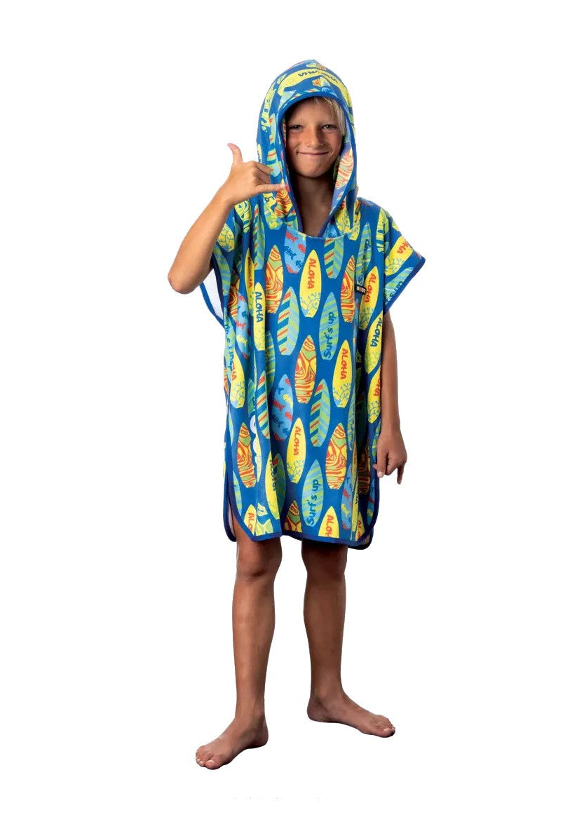 Il poncho in microfibra MAUI è leggero, assorbente e si asciuga rapidamente, ideale per bambini dai 5 ai 10 anni. Con cappuccio e fantasia a tavole da surf colorate, è perfetto per cambiarsi con praticità a bordo vasca o in spiaggia.