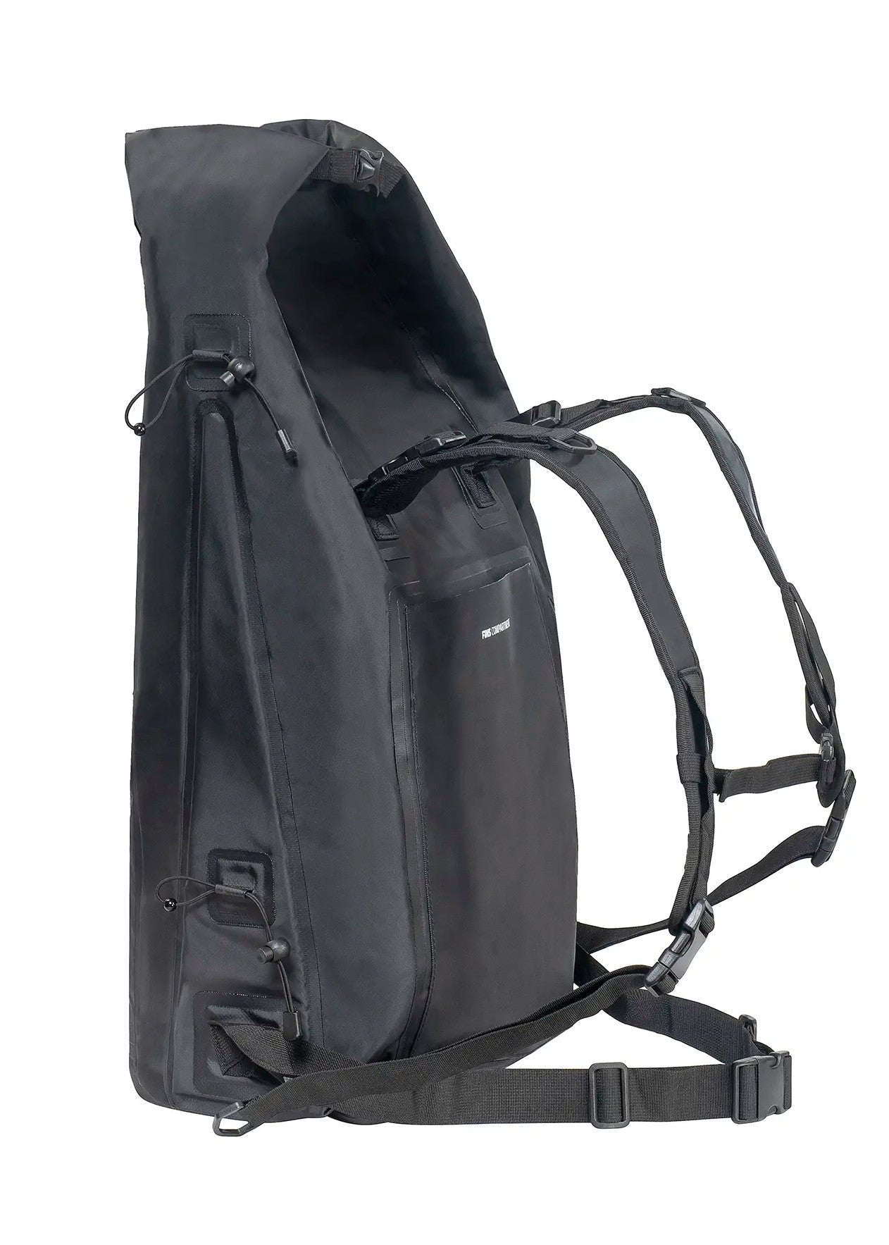 Per una maggiore stabilità durante il trasporto, lo zaino integra supporti laterali direttamente nella struttura del tessuto. Gli elastici laterali permettono di fissare in sicurezza fucili da pesca subacquea o altri oggetti lunghi. Il comfort è assicurato dagli spallacci imbottiti, completamente regolabili e removibili, affiancati da una fascia pettorale e una ventrale che ne migliorano l’aderenza al corpo, caratteristiche particolarmente utili durante l’uso su moto o scooter.